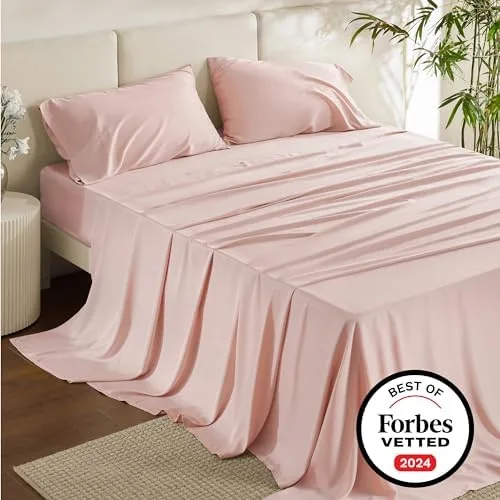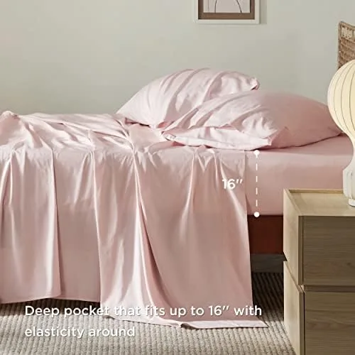 Bedsure Queen Sheets, Rayon Derived from Bamboo, Queen Cooling Sheet Set, Deep Pocket Up to 16″, Breathable & Soft Bed Sheets, Hotel Luxury Silky Bedding Sheets & Pillowcases, Pink
