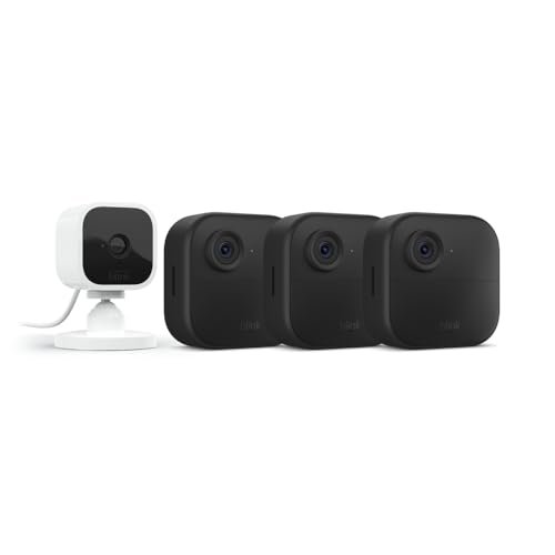 Blink Outdoor 4 (4th Gen) + Blink Mini – Smart security camera, two-way talk, HD live view, motion detection, set up in minutes, Works with Alexa – 3 camera system + Mini (White)