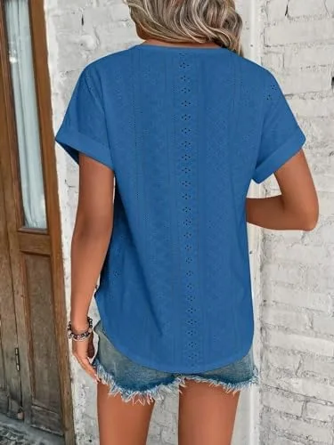 Bliwov Womens Tops Eyelet Embroidery Summer Spring Fashion Clothes 2024 Casual Short Sleeve Blouse Trendy T Shirts