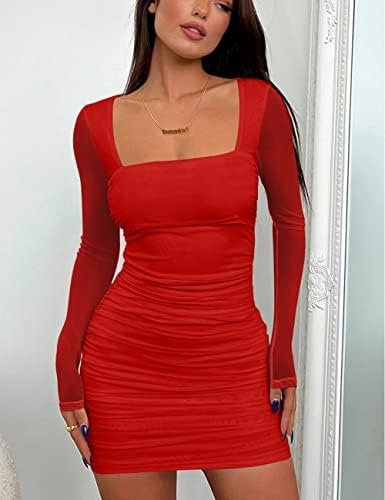 Women’s Sexy Ruched Bodycon Mini Dress Mesh Long Sleeve Club Party Short Dresses