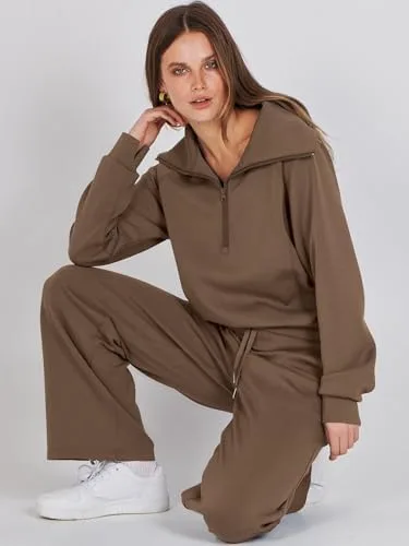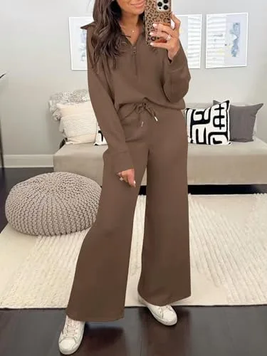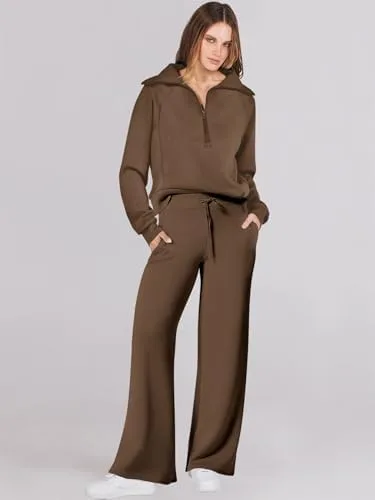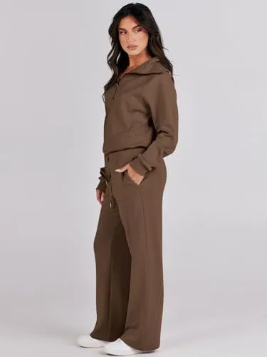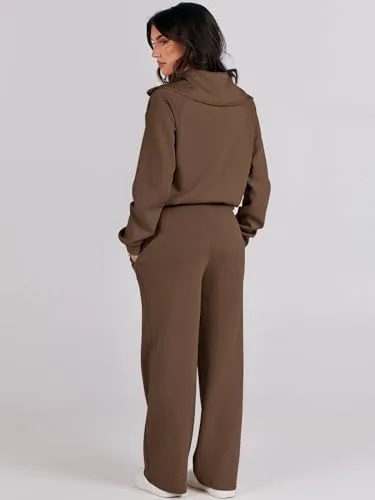 Caracilia Womens 2 Piece Outfits Sweatsuit Set Half Zip Oversized Sweatshirt Wide Leg Sweatpant Fall Lounge Sets Tracksuit