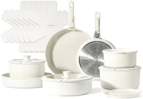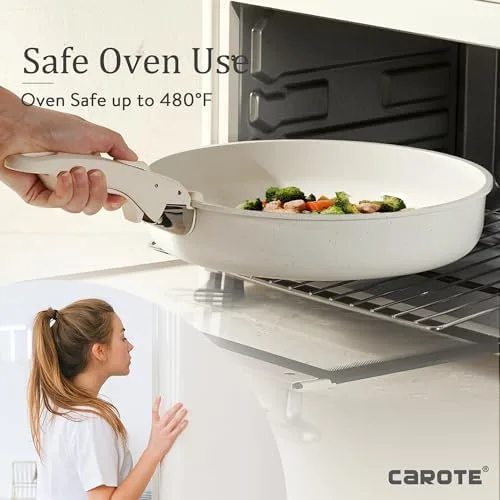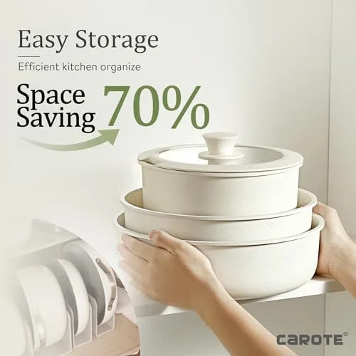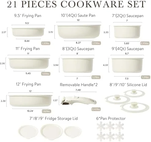 CAROTE 21pcs Detachable Handle Pots and Pan Set, Nonstick Induction Cookware, Removable Handle, RV Oven Safe Cookware, Cream White