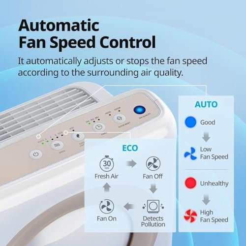 Fan speeds available in 1, 2, 3 stages by manually setting up. While auto mode automatically optimizes the speed setting 1 through 3 based on the level of indoor air quality. When no pollution is detected for 30 minutes, the fan will automatically stop and set as Eco mode to save energy.