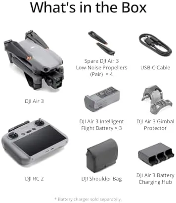 -DJI Air 3 Fly More Combo (DJI RC 2) includes the drone, three Intelligent Flight Batteries, a Battery Charging Hub, and more, as well as the new DJI RC 2, which offers a bright touchscreen and the DJI Fly app pre-installed for an exceptional operating experience.
