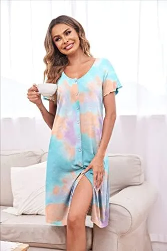 Ekouaer Women’s Nightshirt Short Sleeve Button Down Nightgown V-Neck Sleepwear Pajama Dress