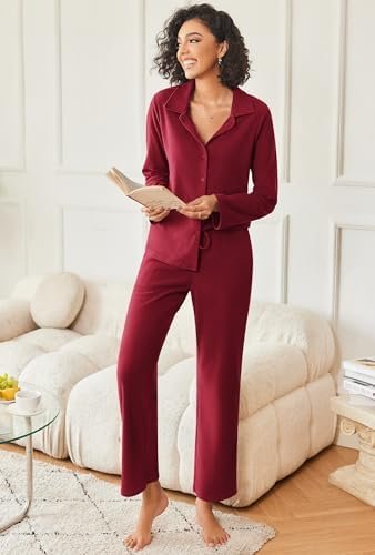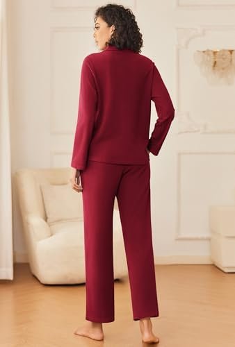 Ekouaer Pajamas with cozy,breathable and fluffy fleece fabric,offer you soft and comfortable feeling.This two piece sleep sets includes a button up long sleeve top with notch-collar and matching loose pants,featuring casual sleepwear style.