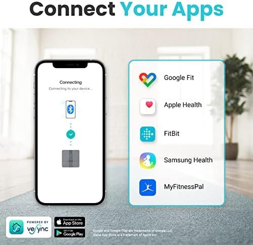 Note: (1) The iphone and apple watch in the image are not included. (2) Only body weight can be synced to MyFitnessPal. MyFitnessPal doesn’t allow syncing all data to VeSync. (3) Consult a healthcare professional before using the smart scale if you are pregnant or using medical electronic equipment such as a pacemaker.