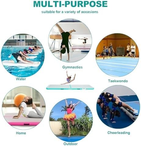 WIDE APPLICATION: you can place the air inflatable mat, inflatable gymnastics mat, gymnastics air inflatable track on the artistic gymnastics floor, the gym floor, in high-performance training, fitness clubs,dance clubs, schools,gymnastic exercises,home entertainment, leisure centers, gymnasium, professional training, park or rental business. Also, it could be used on beach or water,backyard, grass land for Cheerleading/Practice Gymnastics/Beach/Park/Home use.