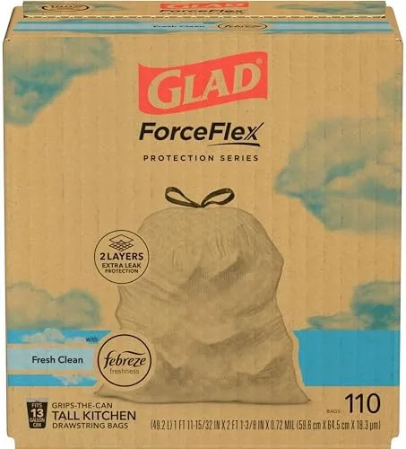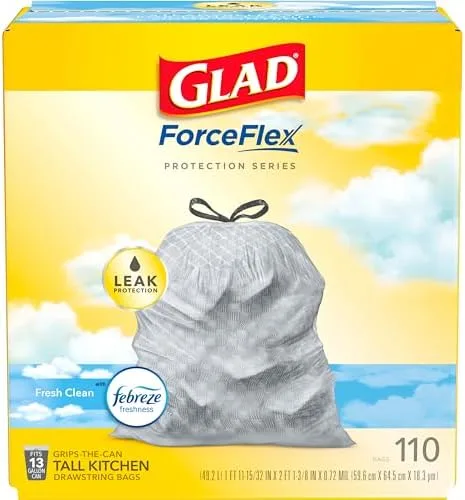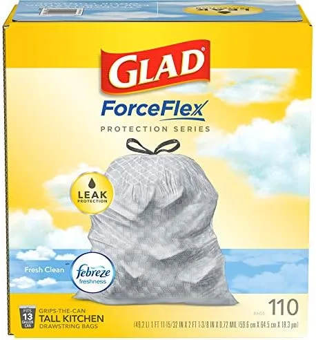 Glad Trash Bags, ForceFlex Tall Kitchen Drawstring Garbage Bags, 13 Gal, Fresh Clean Scent with Febreze, 110 Ct (Packaging May Vary)