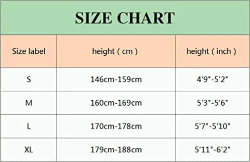 SZIE:Note:1 inch = 2.54 cm;1 CM = 0.39 inches.Size S: Suitable for height from 146cm- 159cm (4’9″-5’2″)———– Size M: Suitable for height from 160cm- 169cm (5’3″-5’6″)Size L: Suitable for height from 170cm- 178 cm (5’7″-5’10”)——— Size XL: Suitable for height from 179cm- 188cm (5’11”-6’2″)