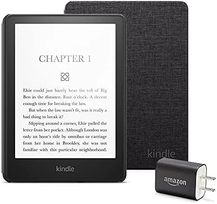 Kindle Paperwhite Essentials Bundle including Kindle Paperwhite (16 GB), Fabric Cover – Black, and Power Adapter