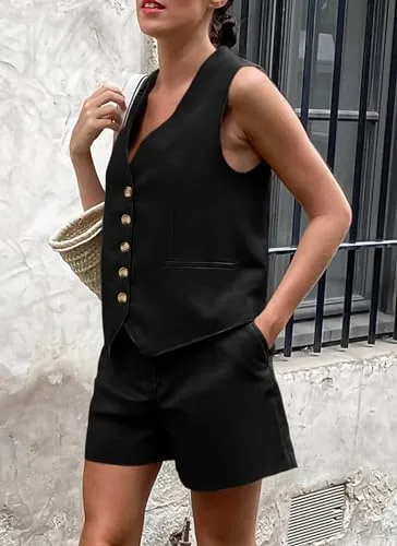PRETTYGARDEN Women’s Summer 2 Piece Outfits Sleeveless Matching Sets Button Down V Neck Vest Waistcoat and Pockets Shorts