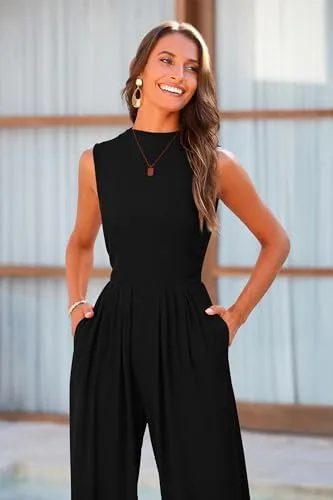 PRETTYGARDEN Womens Summer Jumpsuits Dressy Casual One Piece Outfits Sleeveless Mock Neck Wide Leg Pants Rompers with Pockets