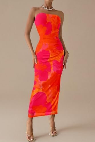 PRETTYGARDEN Women’s Summer Maxi Bodycon Dresses Strapless Tube Top Printed Long Party Club Slit Dress