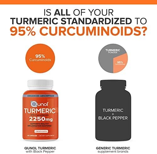 Qunol Turmeric Curcumin with Black Pepper, 2250mg Turmeric Extract with 95% Curcuminoids, Extra Strength Turmeric Supplement, Enhanced Absorption, Joint Support Supplement, 90 Vegetarian Capsules