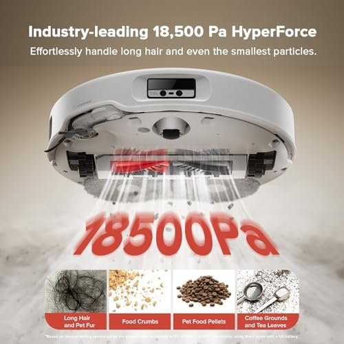 Unmatched Deep Cleaning: Experience powerful suction with 18,500 Pa HyperForce, designed to capture even the smallest dust particles and pet hair. The DuoDivide Main Brush channels debris directly into the dustbin, ensuring that dirt hiding in carpet fibers or between floor gaps is thoroughly removed
