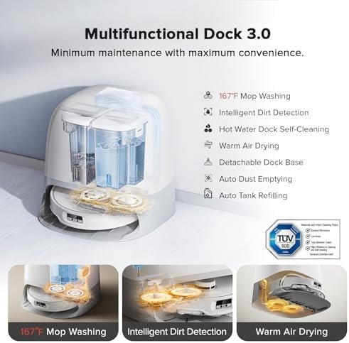 Hands-Free Multifunctional Dock 3.0: Featuring 167°F hot water mop washing, the dock ensures a deep, hygienic clean for both mop and floors. It also includes auto self-cleaning with hot water, warm air drying, and intelligent dirt detection, so your mop is always ready for the next cleaning. With auto dust emptying for up to 7 weeks, auto tank refilling, and a detachable base for added convenience, making home cleaning truly hands-off