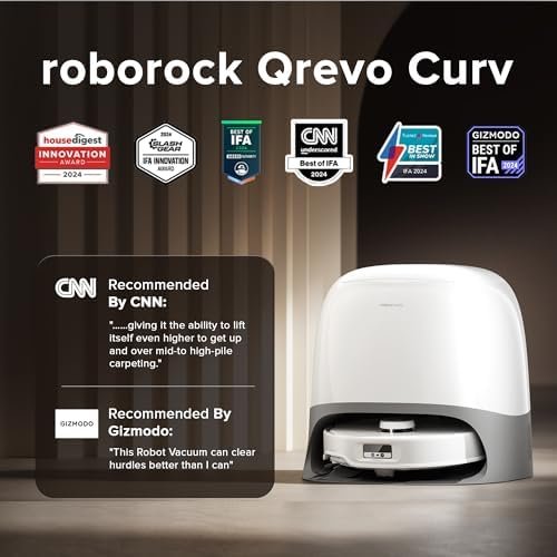 roborock Qrevo Curv Robot Vacuum and Mop, 18,500Pa Suction, Zero-Tangling, DuoDivide Main Brush, FlexiArm Arc Side Brush, FlexiArm Mop, AdaptiLift Chassis, Auto Mop Washing & Drying, Self-Emptying