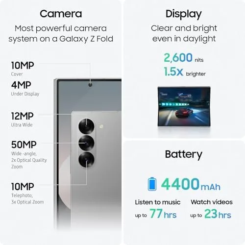 IMMERSIVE SCREEN. IMPRESSIVE GRAPHICS: Level up your screen and level up your gaming experience; Totally immerse yourself with Galaxy Z Fold6 thanks to a huge screen, a lightning-fast processor and incredibly realistic graphics