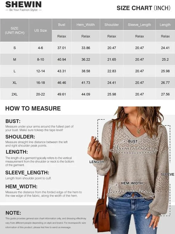 SHEWIN Womens Sweaters Casual Long Sleeve V Neck Lightweight Crochet Pullover Sweater Tops