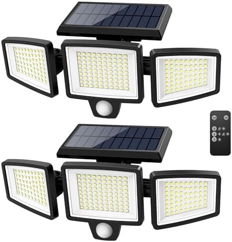 Tuffenough Solar Outdoor Lights 2500LM 210 LED Security Lights with Remote Control,3 Heads Motion Sensor Lights, IP65 Waterproof,270° Wide Angle Flood Wall Lights with 3 Modes(2 Packs)