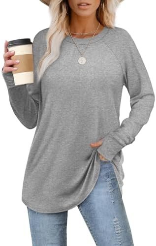 XIEERDUO Womens Tunic Tops to Wear with Leggings Long Sleeve Thumb Hole Shirts Crew Neck Curved Hem